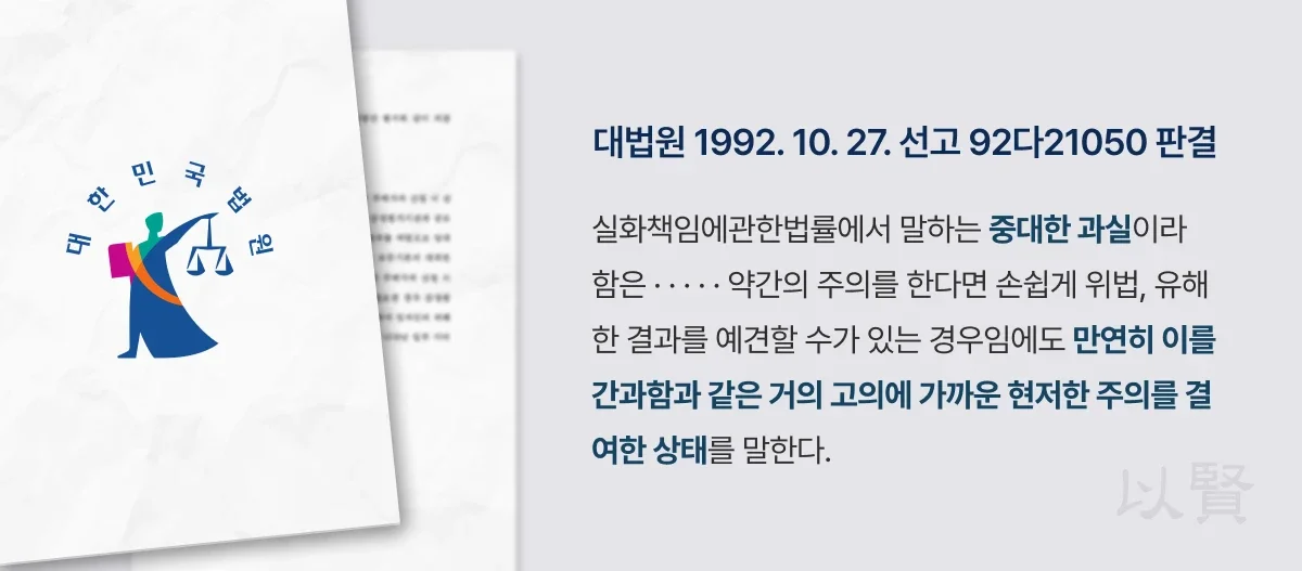 실화책임에관한법률에서 말하는 중대한 과실이라 함은 통상인에게 요구되는 정도의 상당한 주의를 하지 않더라도 약간의 주의를 한다면 손쉽게 위법, 유해한 결과를 예견할 수가 있는 경우임에도 만연히 이를 간과함과 같은 거의 고의에 가까운 현저한 주의를 결여한 상태를 말한다. 대법원 1992. 10. 27. 선고 92다21050 판결