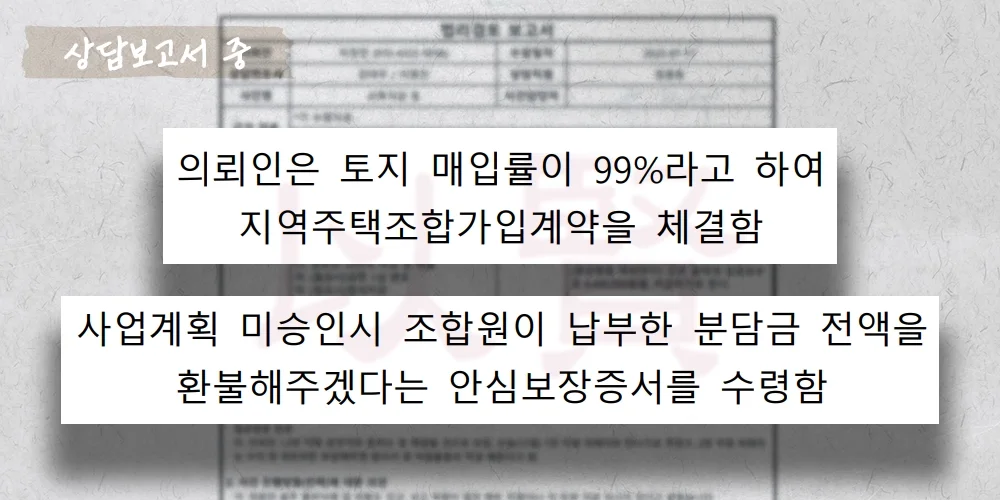 또한 조합 측이 교부한 ‘안심보장증서’ —“사업 미승인 시 계약금 전액 환불 보장” 내용을 핵심 증거로 제시하며 조합의 환불 의무를 강하게 주장했습니다.