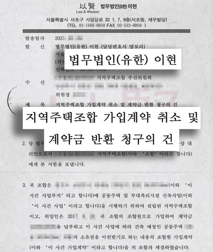 저희 이현은 조합이 “토지 확보 99%” “입주 예정 확정” 등의 허위·과장된 홍보를 통해 조합원을 모집한 점을 포착했습니다. 이에 따라 민법 제110조(사기·강박에 의한 의사표시)를 근거로 조합 가입계약의 취소 의사를 통보하고 계약 취소로 인해 발생한 부당이득 반환(민법 제741조) 책임을 명확히 했죠.