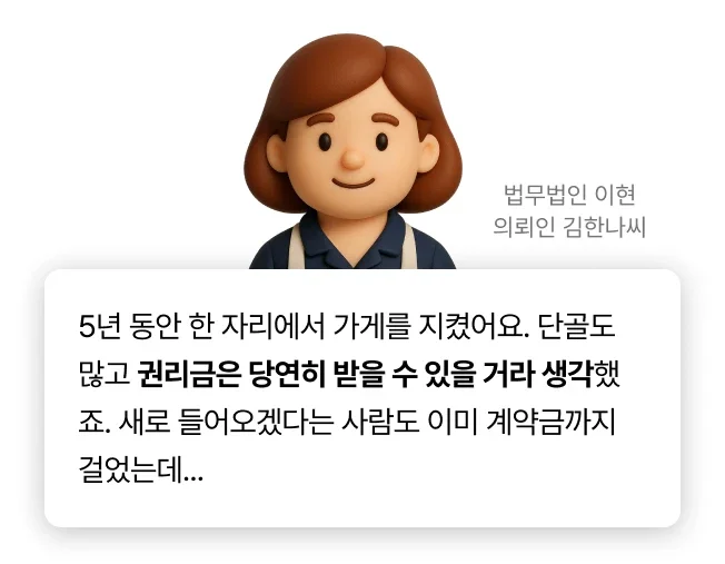 이런 상황이라면 이미 권리금 회수방해가 진행 중일 수 있습니다. 이현은 실질적인 배상을 이끌어낸 경험으로 권리금을 지켜드릴 수 있습니다.