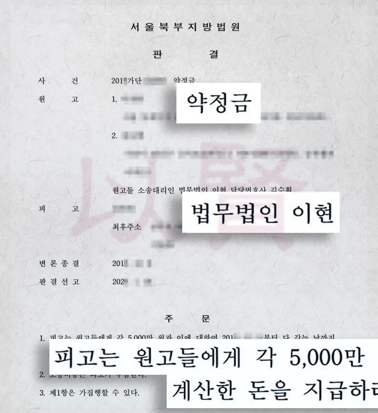 더 이상 참을 수 없었던 의뢰인들은 박 씨를 찾아가 강력하게 항의했습니다. 이에 박 씨는 사정사정하며 "남은 돈 5,000만 원을 2년만 시간을 주면 무슨 일이 있어도 꼭 갚겠다"고 약속하며, 이를 문서로 확약하는 각서(약정서)를 작성해주었습니다. 의뢰인들은 이번에는 다르겠지 하고 마지막으로 믿었으나, 박 씨는 그 약속 기한마저 어기고 돈을 갚지 않았습니다. 결국 의뢰인들은 10년 넘게 이어진 이 지긋지긋한 관계를 끝내고 정당한 권리를 찾기 위해 이현을 찾아와 '약정금 청구 소송'을 제기하게 되었습니다.